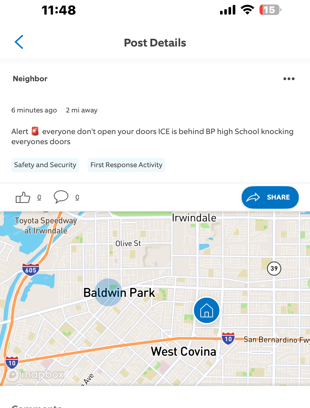 Report of ICE knocking on peoples doors behind bp high school, alert was received on neighborhood app (screenshot attached)
