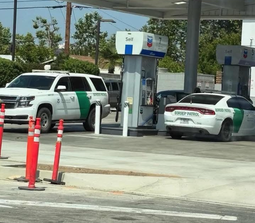 3 border patrol cars are at the chevron gas station on bristol street in santa ana ca next to the in n out